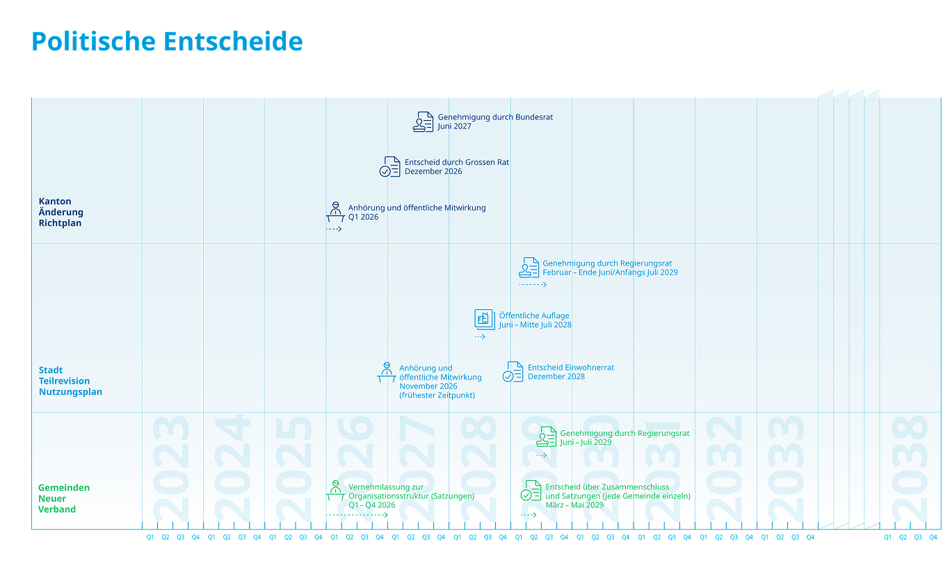 - Kanton: In der ersten Hälfte 2026 haben politische Parteien, Verbände und alle interessierten Privatpersonen im Rahmen der Anhörung und öffentlichen Mitwirkung zur Richtplananpassung die Gelegenheit, ihre Anliegen einzubringen und Stellungnahmen abzugeben. In der Folge wird die bereinigte Richtplananpassung vom Grossen Rat beschlossen und vom Bundesrat genehmigt.