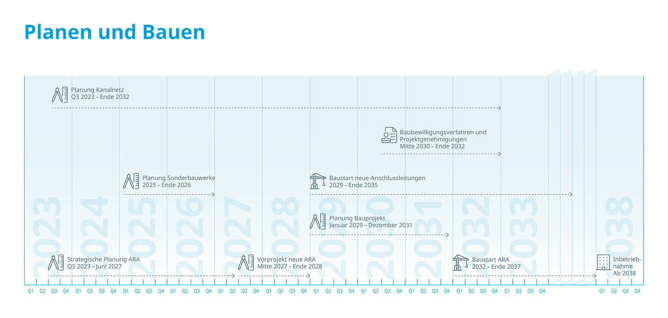 Parallel zu den rechtlichen und politischen Verfahren auf kantonaler und kommunaler Ebene laufen die Planung und die Projektierung der neuen ARA, des Kanalnetzes und der Sonderbauwerke (z.B. Pumpwerk, Überlauf- oder Speicherbecken). Das Vorprojekt für die neue ARA wird voraussichtlich 2027/2028 vorliegen und die Kostensicherheit erhöhen. Anschliessend wird das Bauprojekt erarbeitet, gefolgt von Baubewilligungsverfahren und Projektgenehmigungen. Falls das Projekt alle politischen Hürden nimmt und die Baugesuche von den zuständigen Stellen bewilligt werden, beginnen 2029 die Bauarbeiten für die Anschlussleitungen und 2032 jene für die neue ARA. Nach rund sechsjähriger Bauzeit geht die neue Anlage im Lauf des Jahres 2038 in Betrieb.